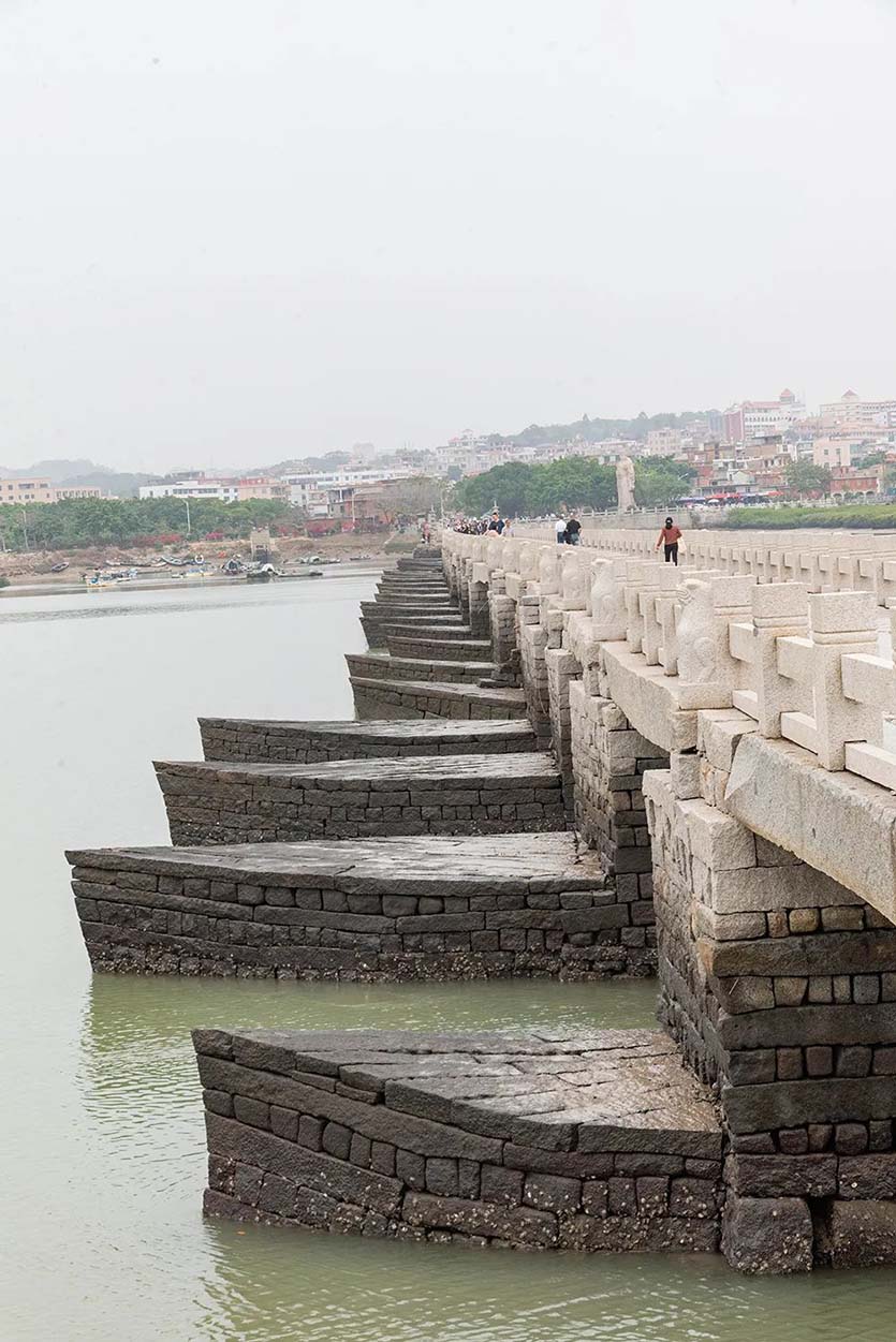 另外,洛陽橋還創(chuàng)造性地采用了“浮運架梁”技術(shù)。洛陽橋由橋墩、橋梁板、欄桿等部分構(gòu)成,橋梁板石板呈縱向排布,為整塊條石,架設(shè)在下方橋基上。條石最長的11米,寬0.98米,厚0.8米,重達(dá)10余噸。